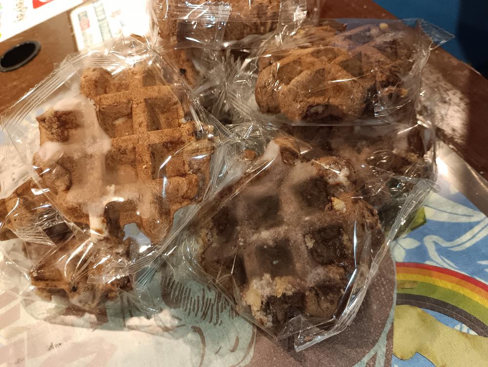 ベルギーの職人さんたちが焼き上げているワッフルです。寒いですが、冷凍のままでも、砂糖のザクザク食感が美味しいです。