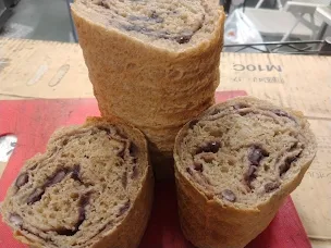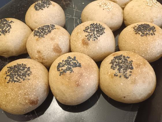 自家配合の甘さ控えめの黒ゴマあんを、甘さ控えめの玄米パンに包みました。